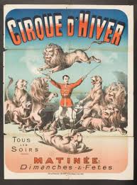 Affiche publicitaire montrant des lions costumés dans un spectacle. L'animal comme objet du spectacle, humanisé et détourné pour divertir le public.